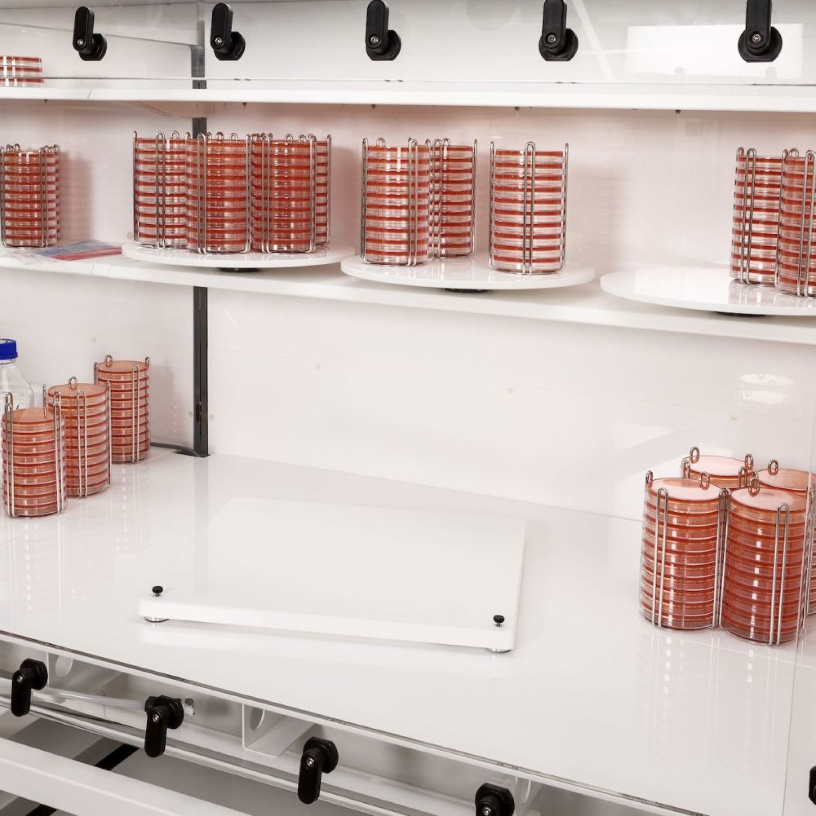 A robust platform with castors, designed to help move larger equipment around inside a Whitley Workstation.