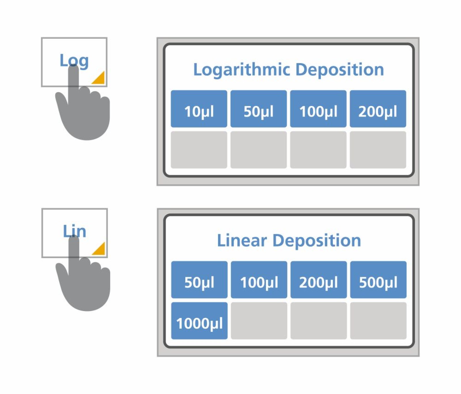 This option has been developed for the WASP Touch. In addition to the standard deposition volumes of 50 and 100µl Log depositions, the Extended Volume Package allows for a  greater number of replicate plates, linear deposition profile and a wider range of deposition profiles: 10, 200µl Log and 50, 100, 200, 500, 1000µl Lin.