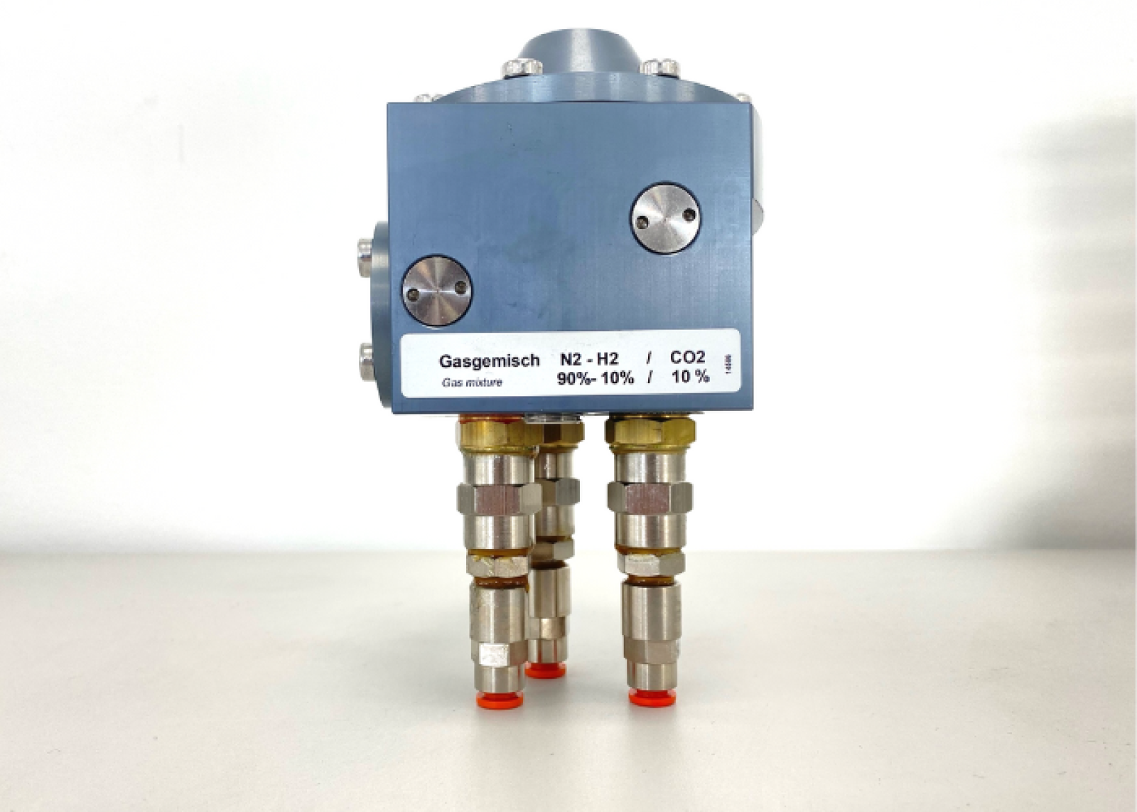 The system has two gas inputs for pre mixed 10% hydrogen / 90 % nitrogen along with a cylinder of CO. The single output provides the two gasses, mixed into the typical ratio of 10% hydrogen, 10% CO and 80% nitrogen.