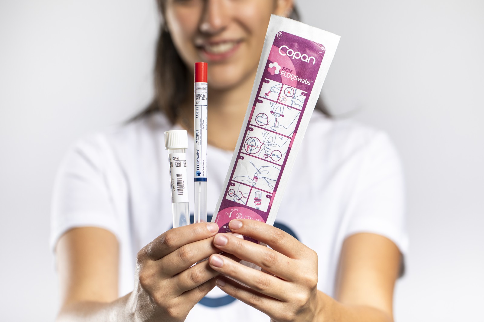 Self-vaginal FLOQSwabs® are manufactured by Copan, designed for self-collection with a soft and small tip, ergonomic shaft, insertion length mark, and clear instructions. This device is made of polyester enabling a more elastic, durable, less brittle, and safer to use self-collection device.