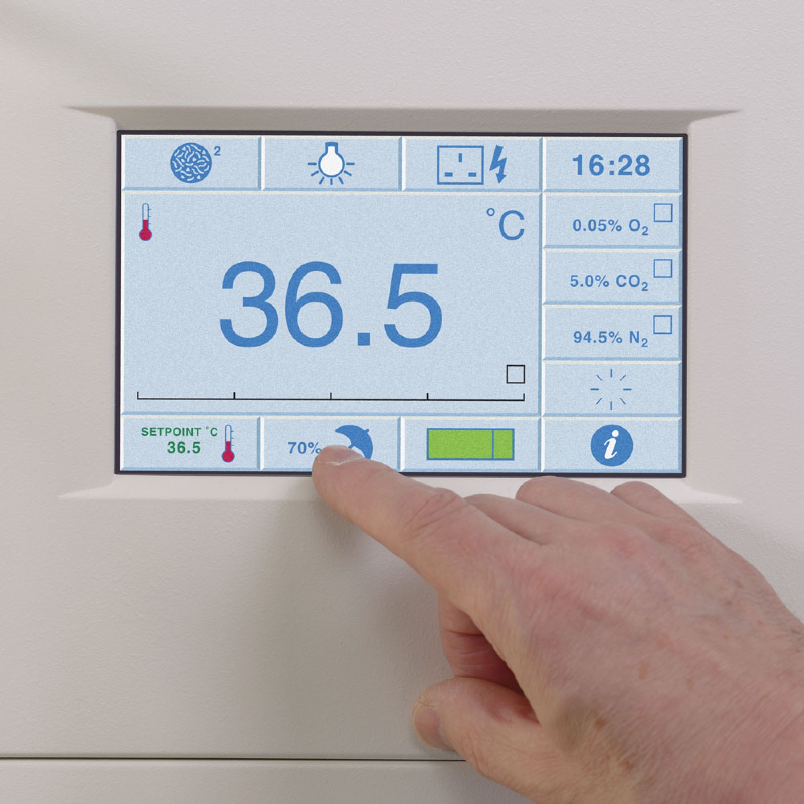 • Colour, touchscreen control panel for ease of use and for visual display of parameters such as O2 level, CO2 level, temperature, humidity and airlock cycle status.